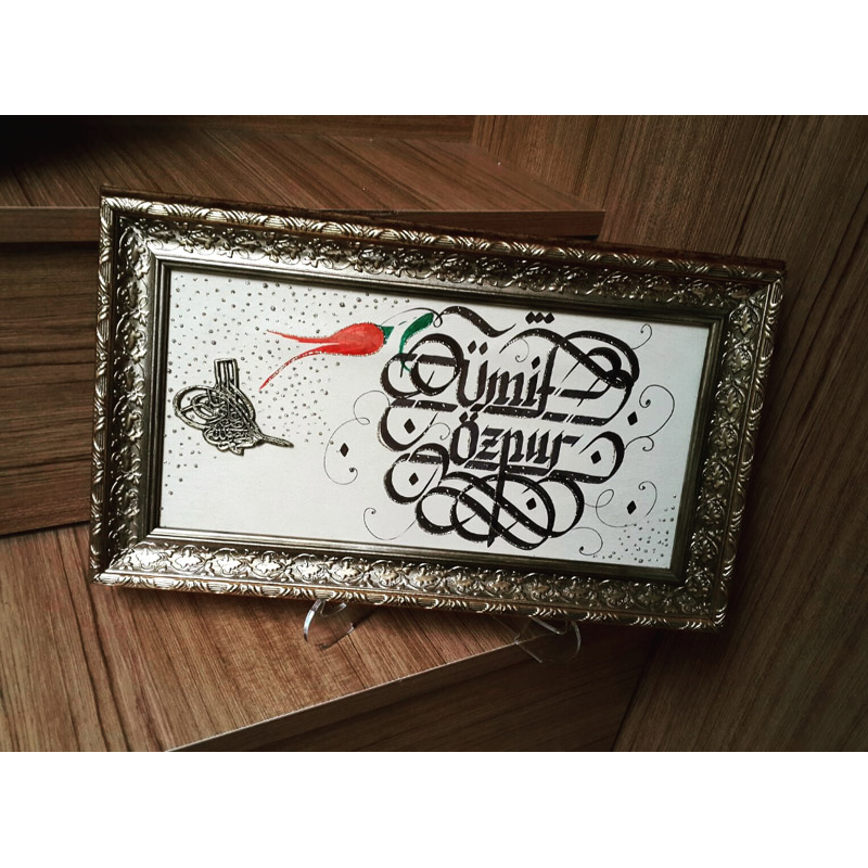 Ürün Tablolu - Çerçeveli Fon Kağıt Üzerine Kısa İsim veya Uzun yazı şeklinde Osmanlıca, Arapça, Türkçe şekilde Kaligrafi Yazılabilmektedir. Uzun yazı ve diğer diller için bizi arayarak fiyat alabilirsiniz.
