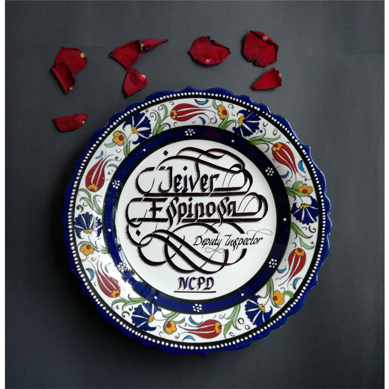 Ürün Çini Tabak Üzerine Kısa İsim veya Uzun yazı şeklinde Osmanlıca, Arapça, Türkçe şekilde Kaligrafi Yazılabilmektedir. Uzun yazı ve diğer diller için bizi arayarak fiyat alabilirsiniz.