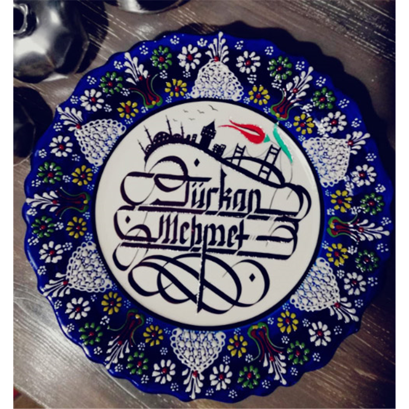 Ürün Çini Tabak Üzerine Kısa İsim veya Uzun yazı şeklinde Osmanlıca, Arapça, Türkçe şekilde Kaligrafi Yazılabilmektedir. Uzun yazı ve diğer diller için bizi arayarak fiyat alabilirsiniz.