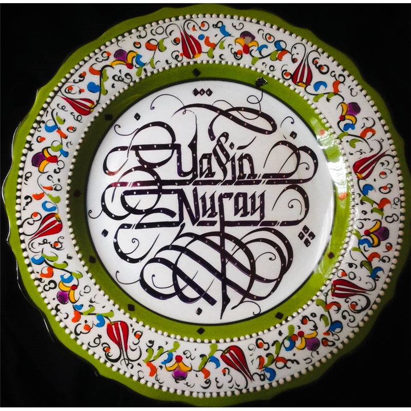 Ürün Çini Tabak Üzerine Kısa İsim veya Uzun yazı şeklinde Osmanlıca, Arapça, Türkçe şekilde Kaligrafi Yazılabilmektedir. Uzun yazı ve diğer diller için bizi arayarak fiyat alabilirsiniz.