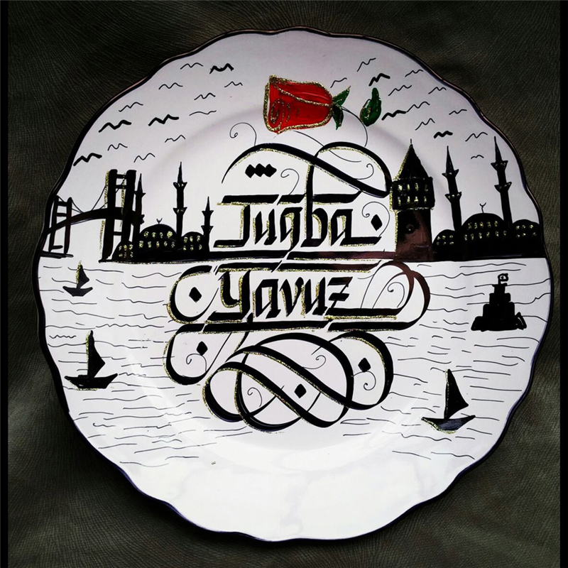 Ürün Seramik Tabak Üzerine Kısa İsim veya Uzun yazı şeklinde Osmanlıca, Arapça, Türkçe şekilde Kaligrafi Yazılabilmektedir. Uzun yazı ve diğer diller için bizi arayarak fiyat alabilirsiniz.
