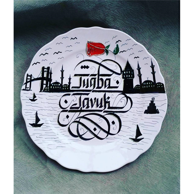 Ürün Çini Tabak Üzerine Kısa İsim veya Uzun yazı şeklinde Osmanlıca, Arapça, Türkçe şekilde Kaligrafi Yazılabilmektedir. Uzun yazı ve diğer diller için bizi arayarak fiyat alabilirsiniz.
