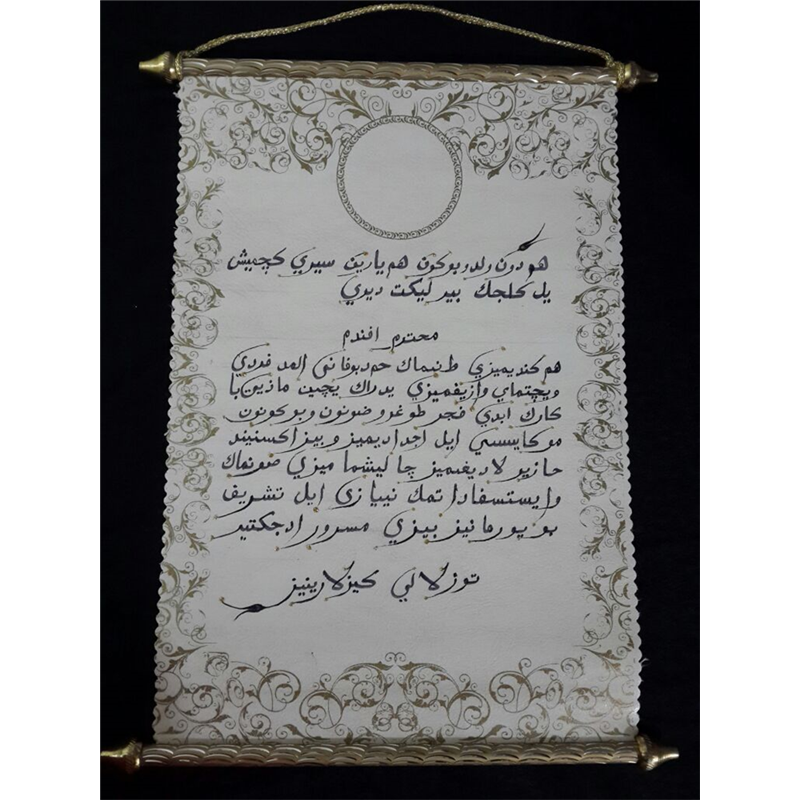 Ürün Ferman Üzerine Kısa İsim veya Uzun yazı şeklinde Osmanlıca, Arapça, Türkçe şekilde Kaligrafi Yazılabilmektedir. Uzun yazı ve diğer diller için bizi arayarak fiyat alabilirsiniz.