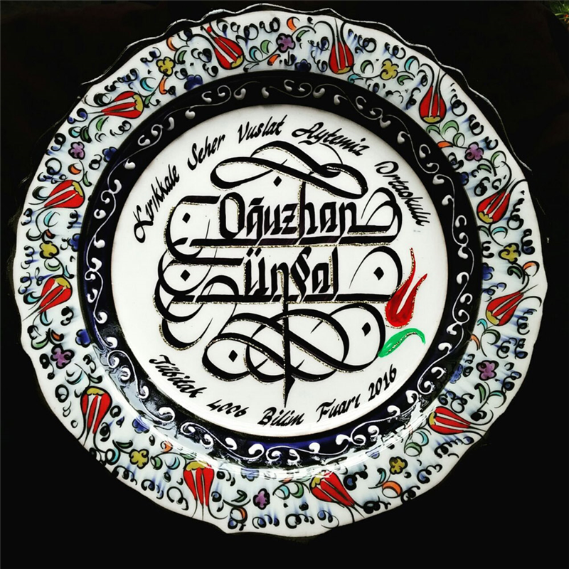 Ürün Çini Tabak Üzerine Kısa İsim veya Uzun yazı şeklinde Osmanlıca, Arapça, Türkçe şekilde Kaligrafi Yazılabilmektedir. Uzun yazı ve diğer diller için bizi arayarak fiyat alabilirsiniz.